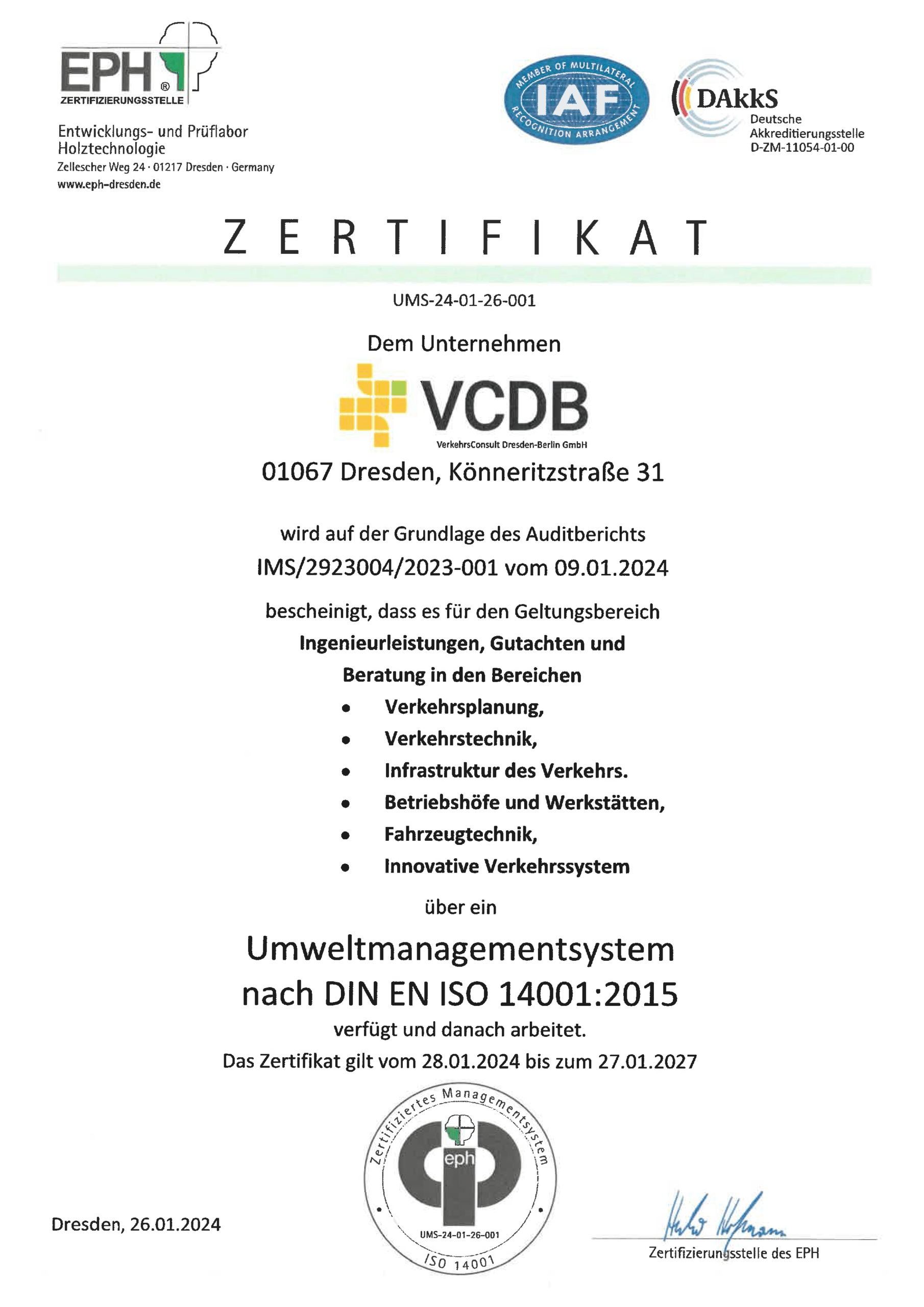 Ein hoher interner und externer Qualitätsanspruch und die Verpflichtung zu nachhaltigem und ressourcenschonendem Handeln sind fest im Unternehmensalltag der VCDB verankert und werden von allen Mitarbeitern aktiv gelebt. Um diesen Ansprüchen dauerhaft gerecht zu werden, hat die VCDB ein integriertes Managementsystem nach ISO 9001 (Qualitätsmanagementsystem, zertifiziert seit 2005) und ISO 14001 (Umweltmanagementsystem, zertifiziert seit 2014) etabliert.
